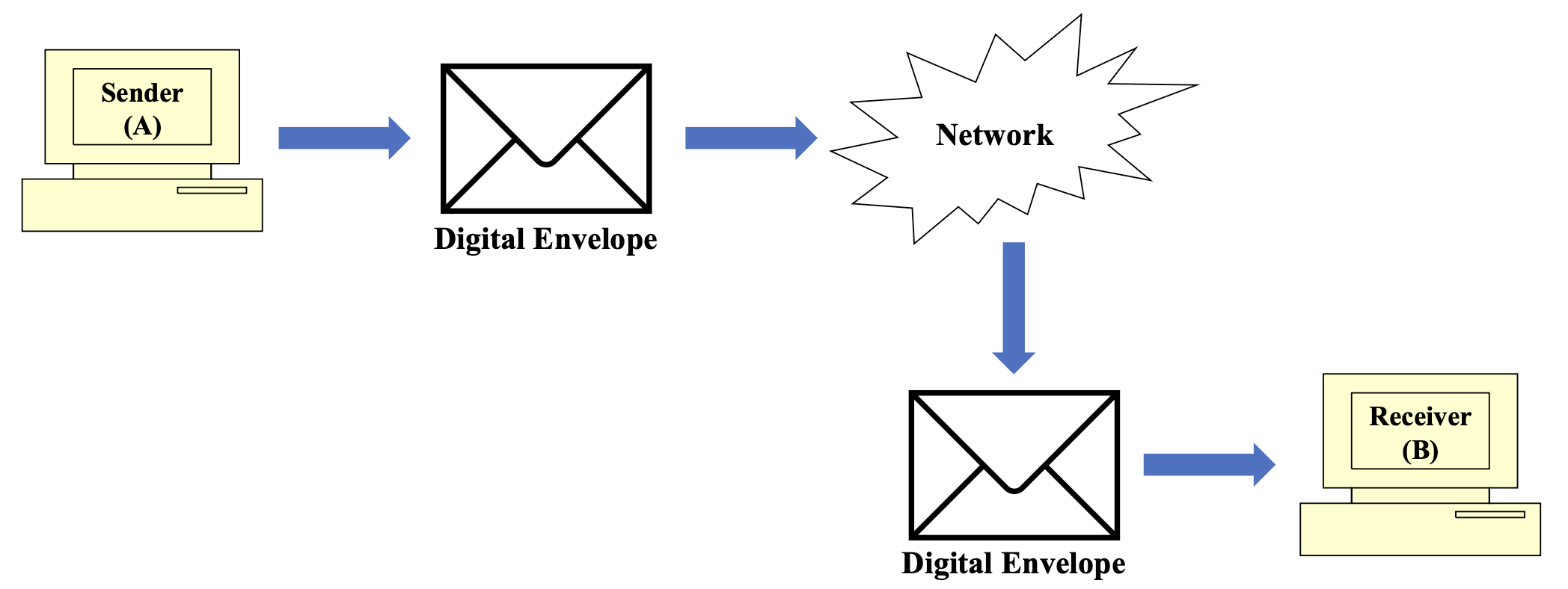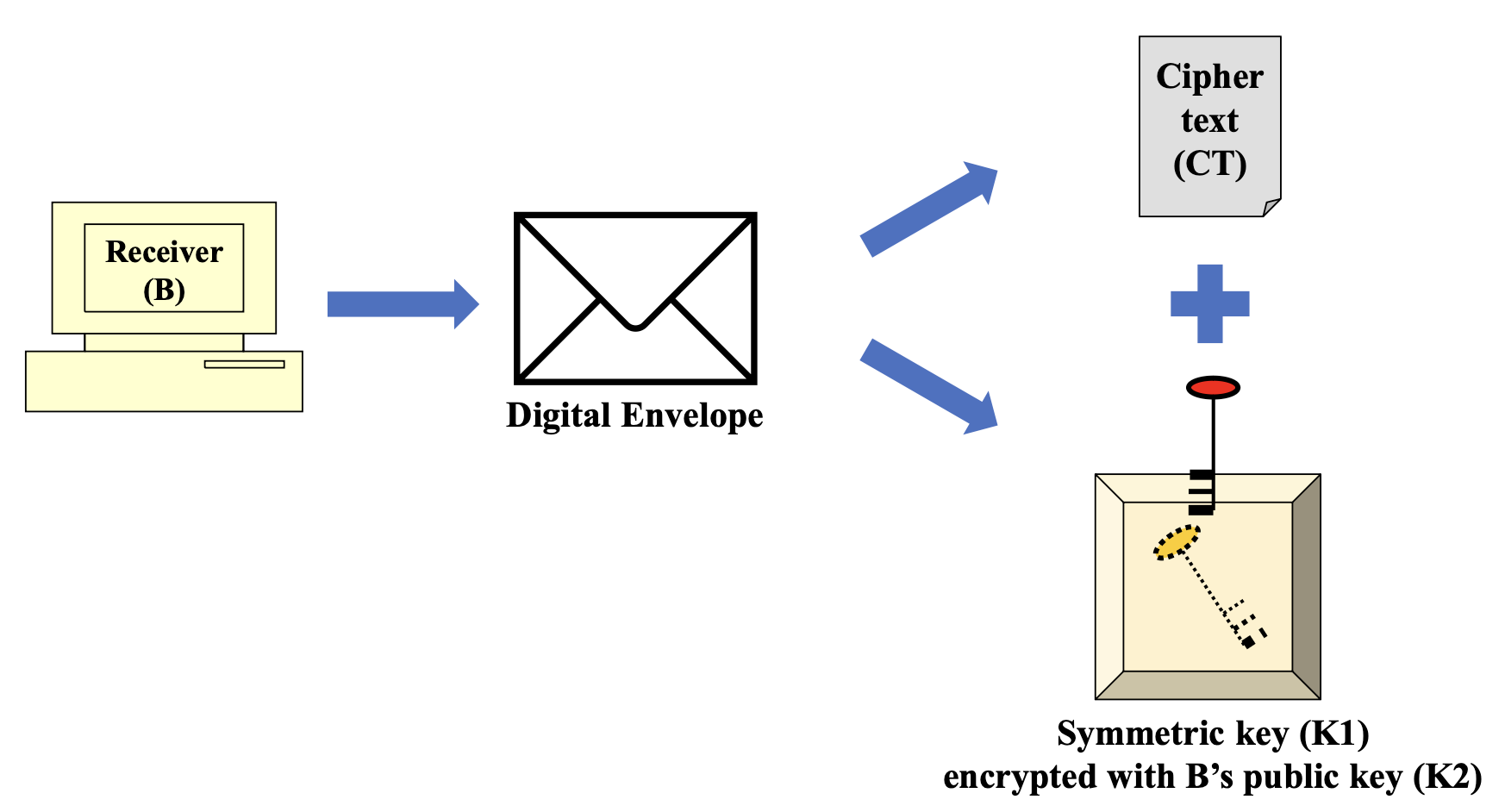 - 암호화된 메시지와 암호화된 키를 묶어서 Digital Envelope 생성