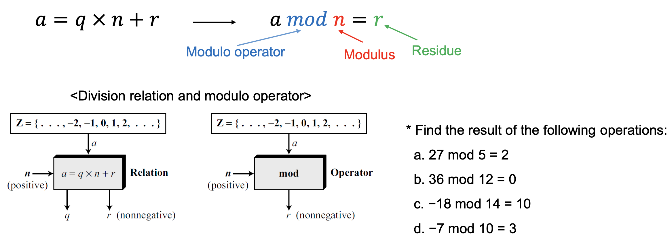 RSA를 이해하려면 모듈러 연산에 대한 이해가 필요하다. 모듈러 연산에서는 나머지 r만 관심 대상이다.