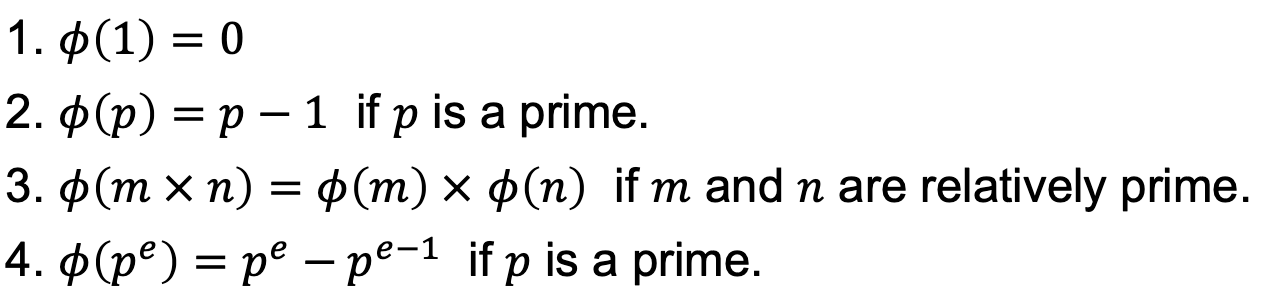 - φ(10) = ? → φ(10) = φ(2) × φ(5) = 1 × 4 = 4 (2와 5는 소수)