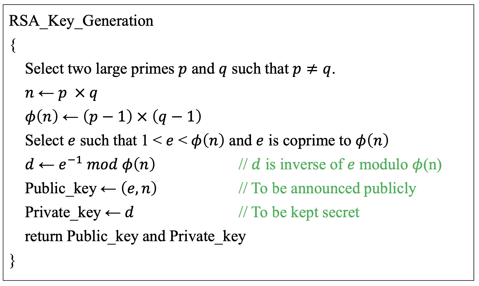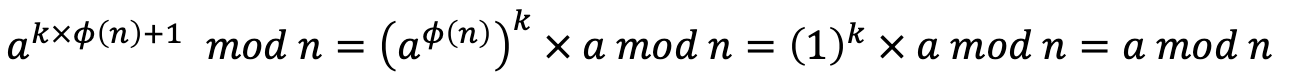 - 두 번째 버전 (RSA에서 사용): n = p × q, a < n, k가 정수일 때 a^(k×φ(n)+1) ≡ a (mod n)