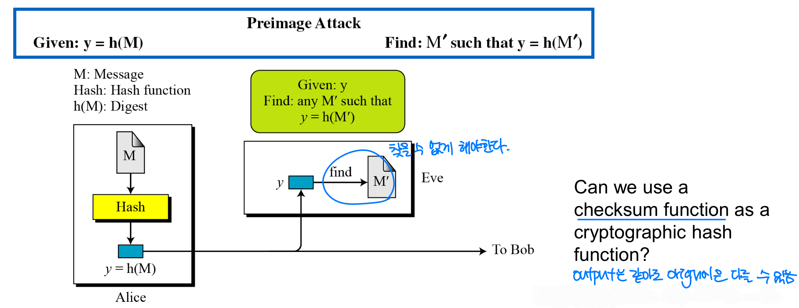 - 다이제스트가 주어졌을 때 원본 메시지를 찾기 매우 어려워야 한다