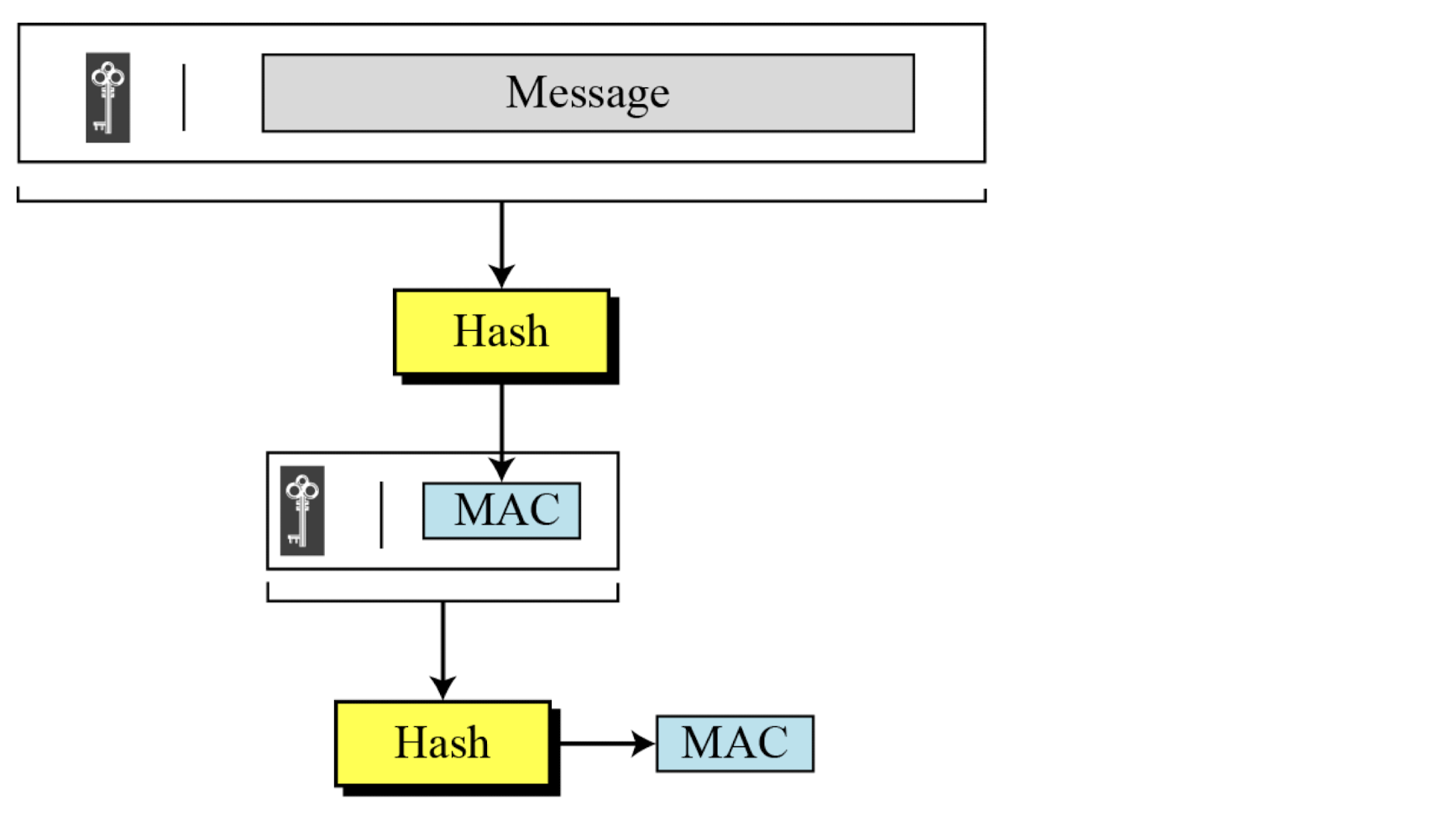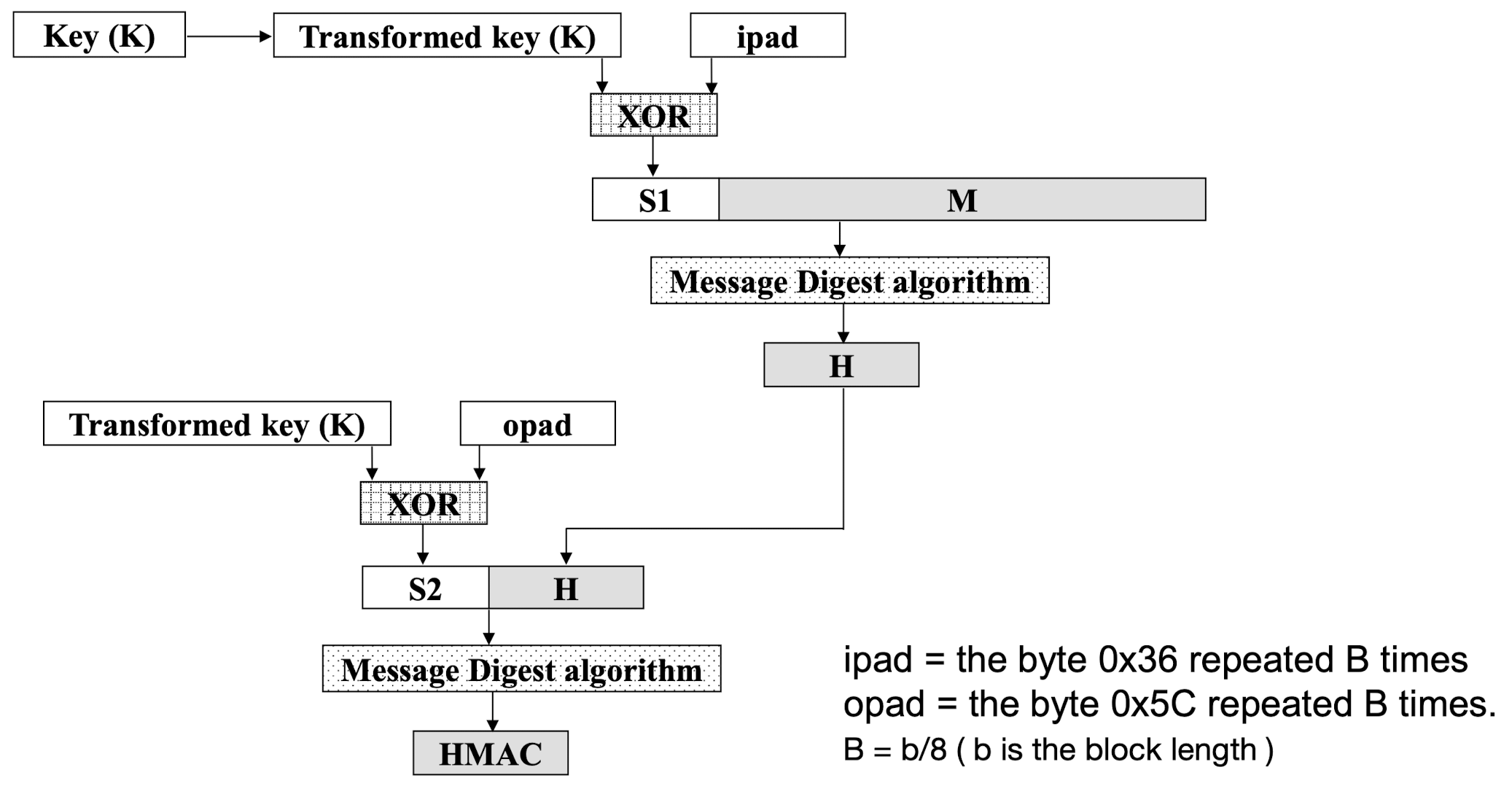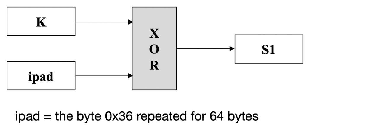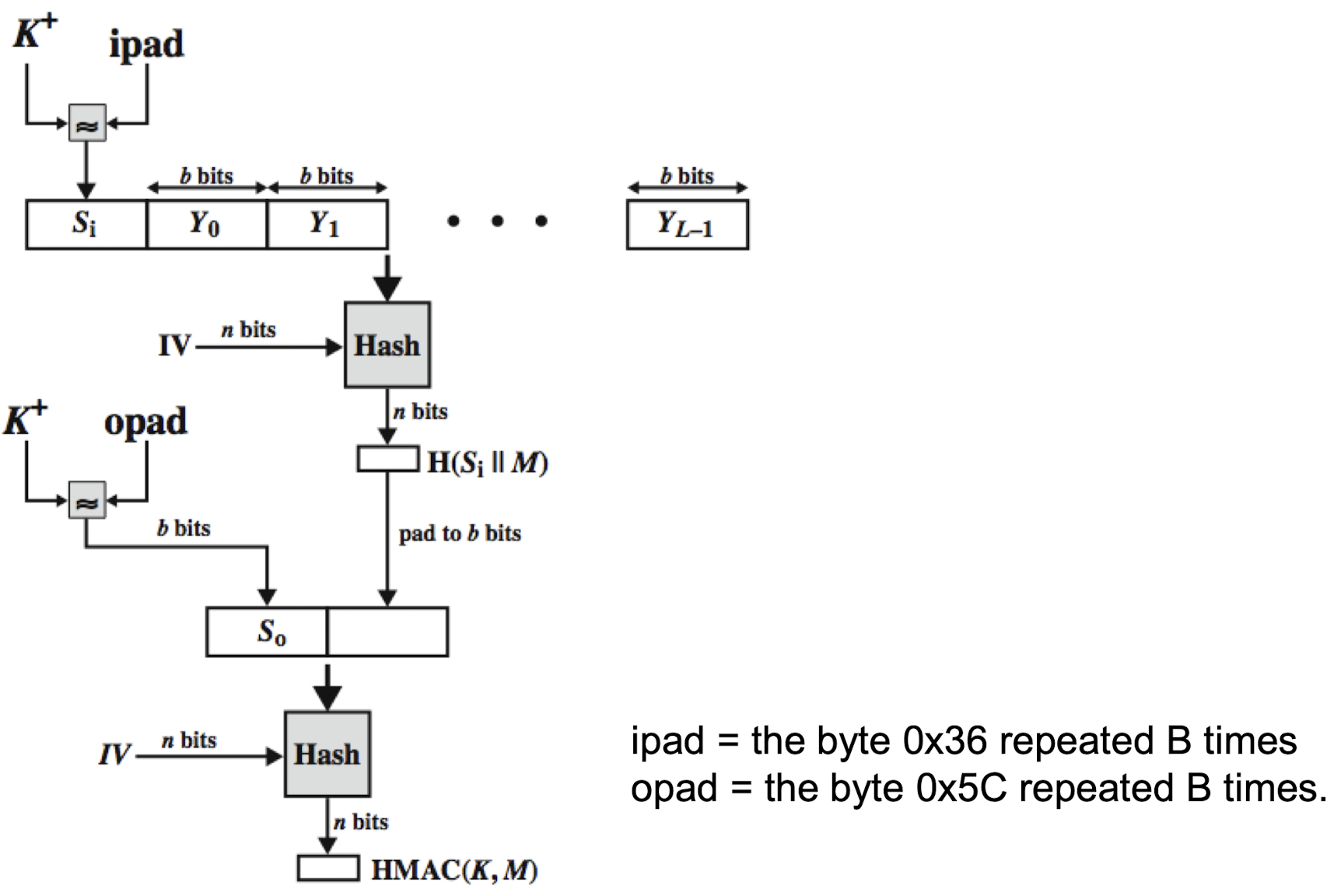 HMAC_K(M) = Hash[(K+ XOR opad) || Hash[(K+ XOR ipad) || M)]