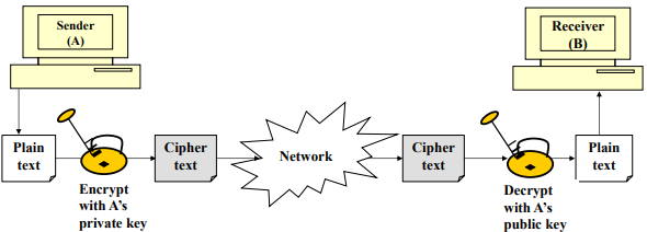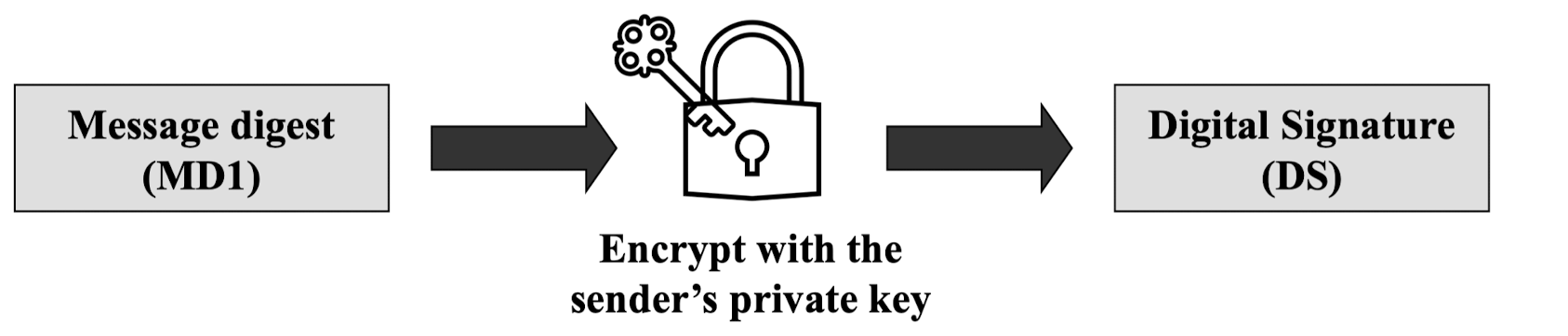송신자가 메시지 또는 그 지문을 자신의 개인키로 암호화한다. 이는 오직 송신자만이 이 메시지를 생성할 수 있음을 보장한다.