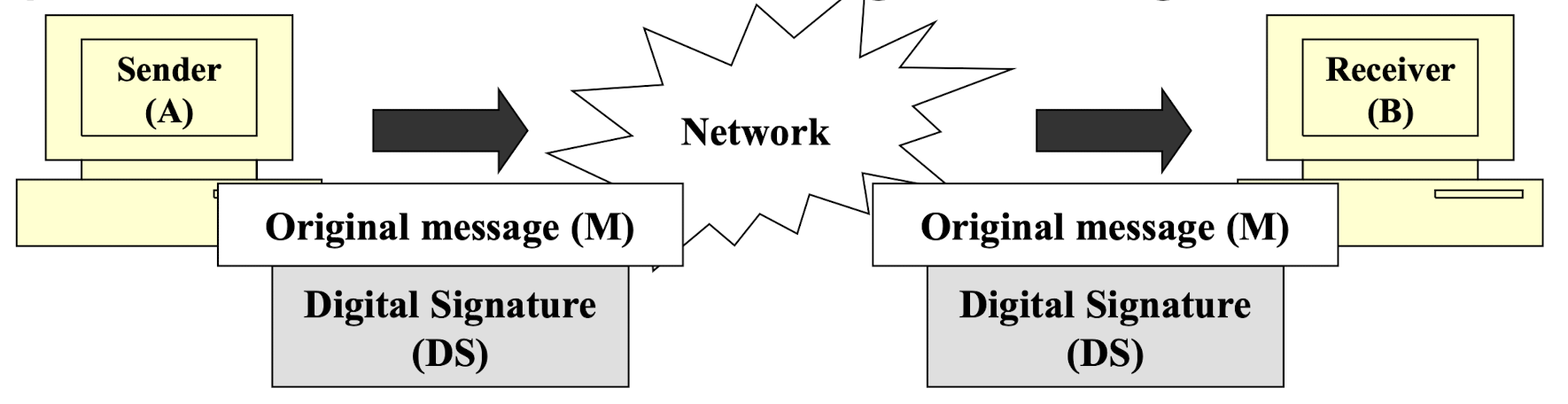 디지털 서명은 발신자 신원 검증, 메시지 무결성, 부인 방지를 직접 제공한다. 메시지 기밀성을 위해서는 여전히 암호화/복호화가 필요하다.