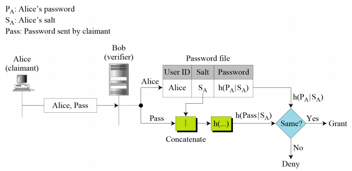 - Unix/Linux: shadow password file 사용 (/etc/passwd와 분리, 보통 /etc/shadow)