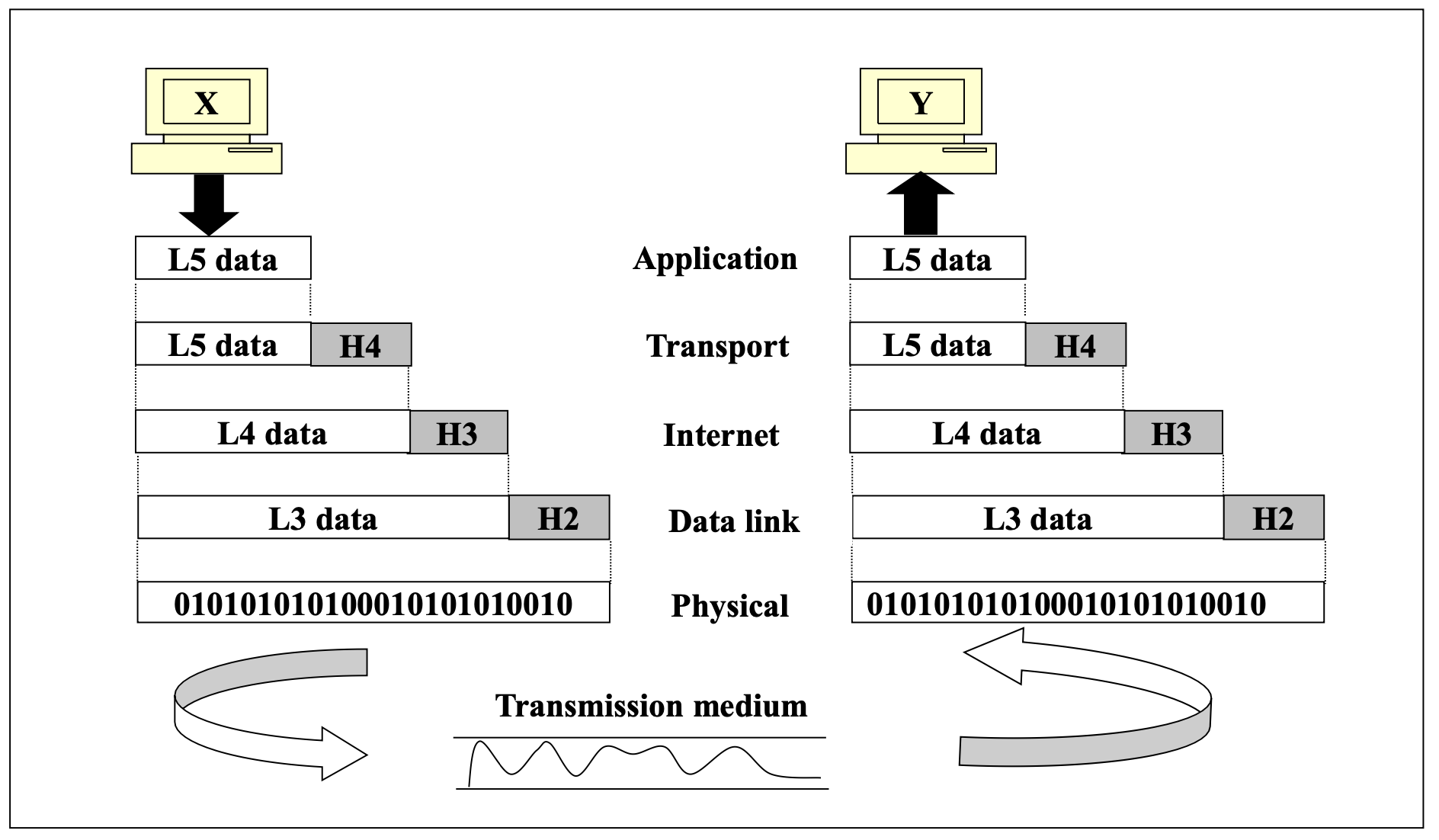 물리 계층을 제외한 모든 계층은 같은 컴퓨터의 인접 계층과 통신한다. 실제로 두 컴퓨터 간 전송이 이루어지는 곳은 물리 계층뿐이다.