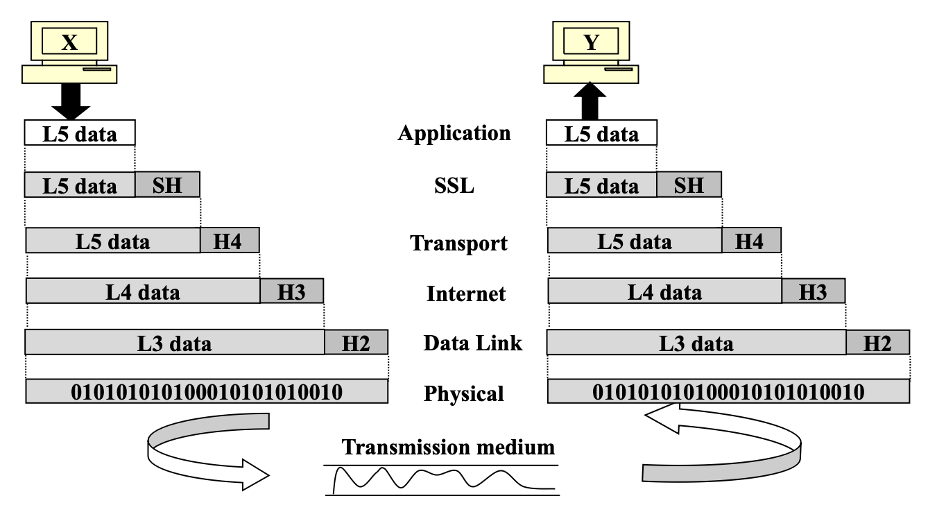 송신 측의 SSL 계층은 애플리케이션 계층에서 받은 데이터를 암호화하고 자체 헤더(SH)를 추가한다. 수신 측의 SSL 계층은 SH를 제거하고 데이터를 복호화하여 애플리케이션 계층에 전달한다.