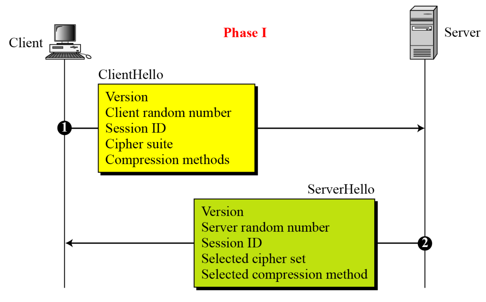 - 양쪽이 지원하는 최고 버전, 새 난수, 선택된 cipher suite와 압축 방식을 포함