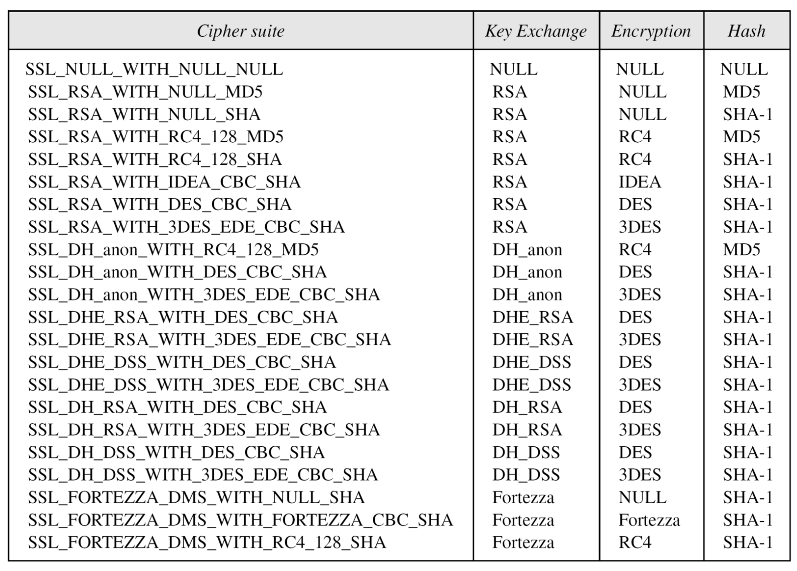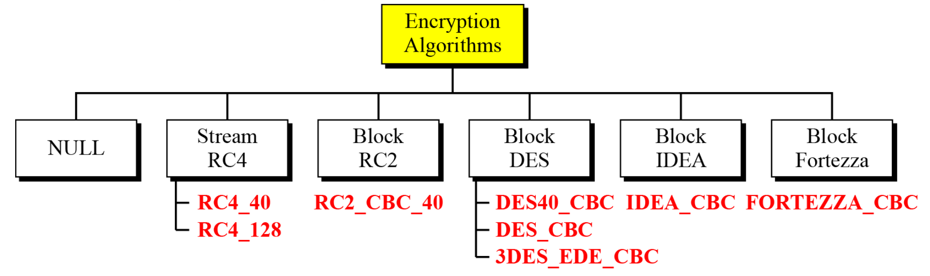 - 지원 알고리즘: AES, IDEA, RC2-40, DES-40, DES, 3DES, Fortezza, RC4-40, RC4-128