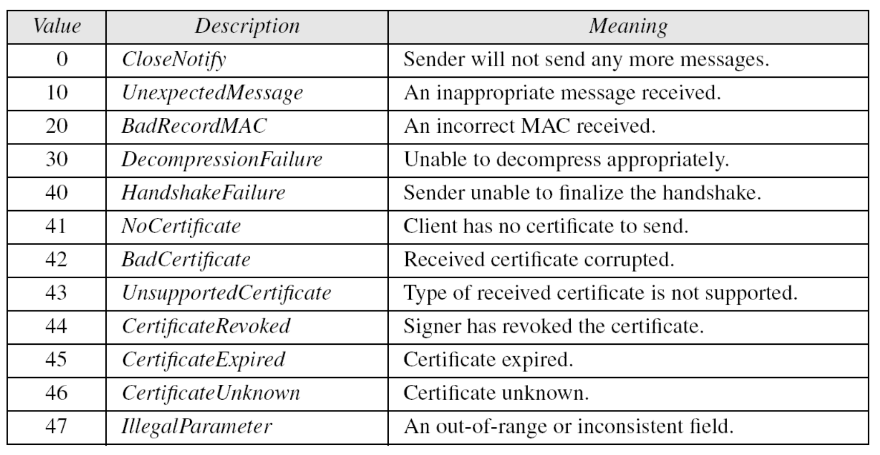 | warning | close notify, no certificate, bad certificate, unsupported certificate, certificate revoked, certificate expired, certificate unknown |