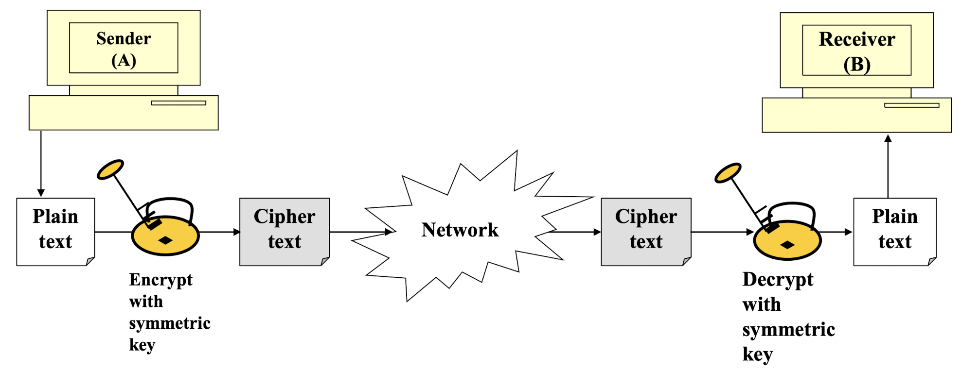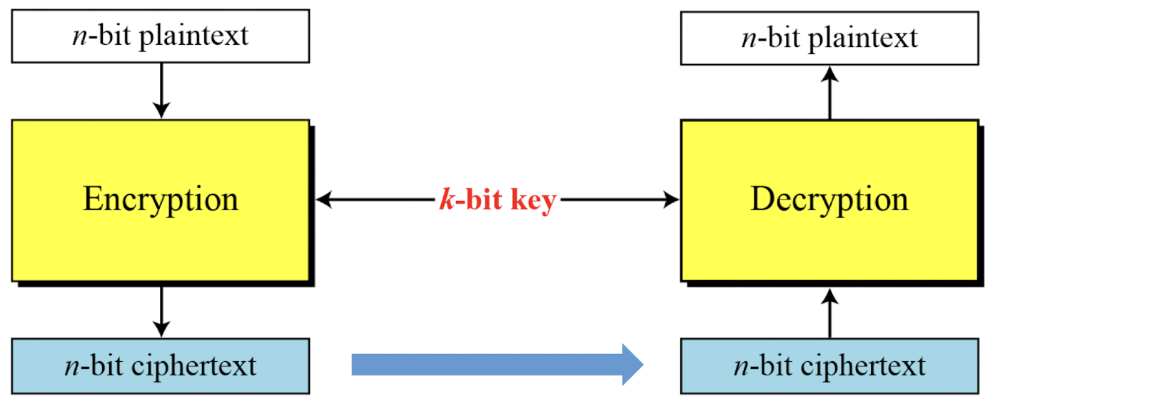 대칭키 블록 암호는 n비트 블록의 평문을 암호화하거나 암호문을 복호화한다. 이때 k비트 키를 사용한다.
