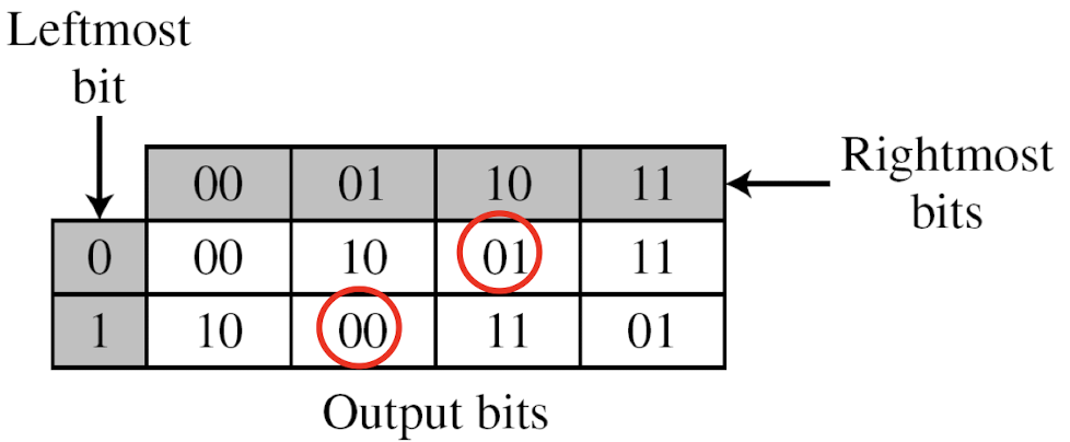 예제: 3 x 2 크기의 S-Box. 입력의 가장 왼쪽 비트가 행을, 오른쪽 두 비트가 열을 결정한다.