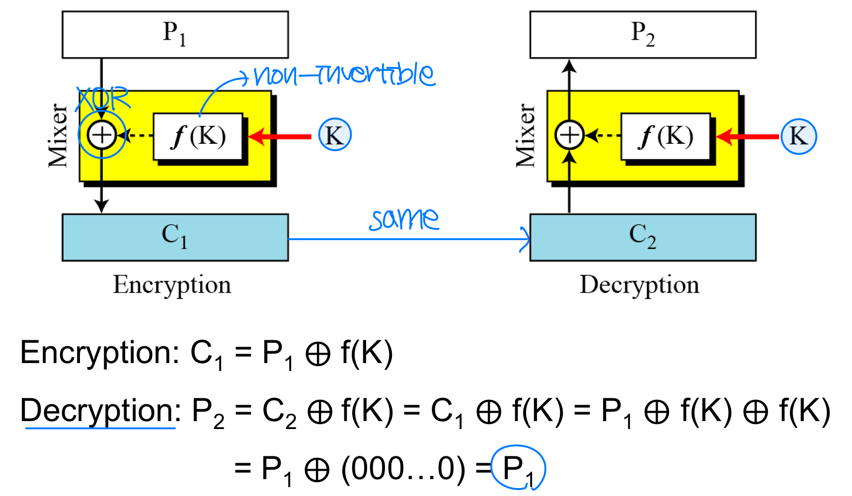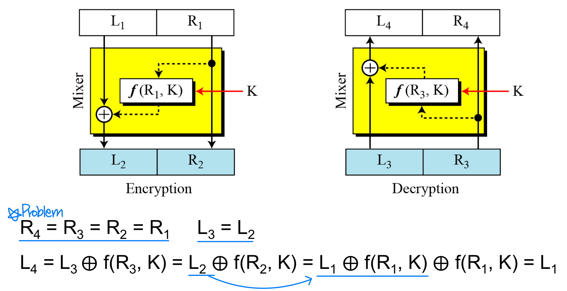 핵심 질문: 역연산 불가능한 유닛이 있는데 어떻게 암호화와 복호화가 서로의 역이 될 수 있는가? Feistel은 이들이 상쇄될 수 있음을 보였다.