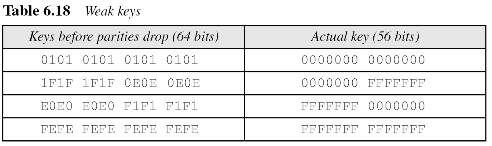 DES에서 논의한 약한 키(Weak keys) 개념은 AES에 적용되지 않는다. 암호키의 모든 비트가 0이라고 가정하면: