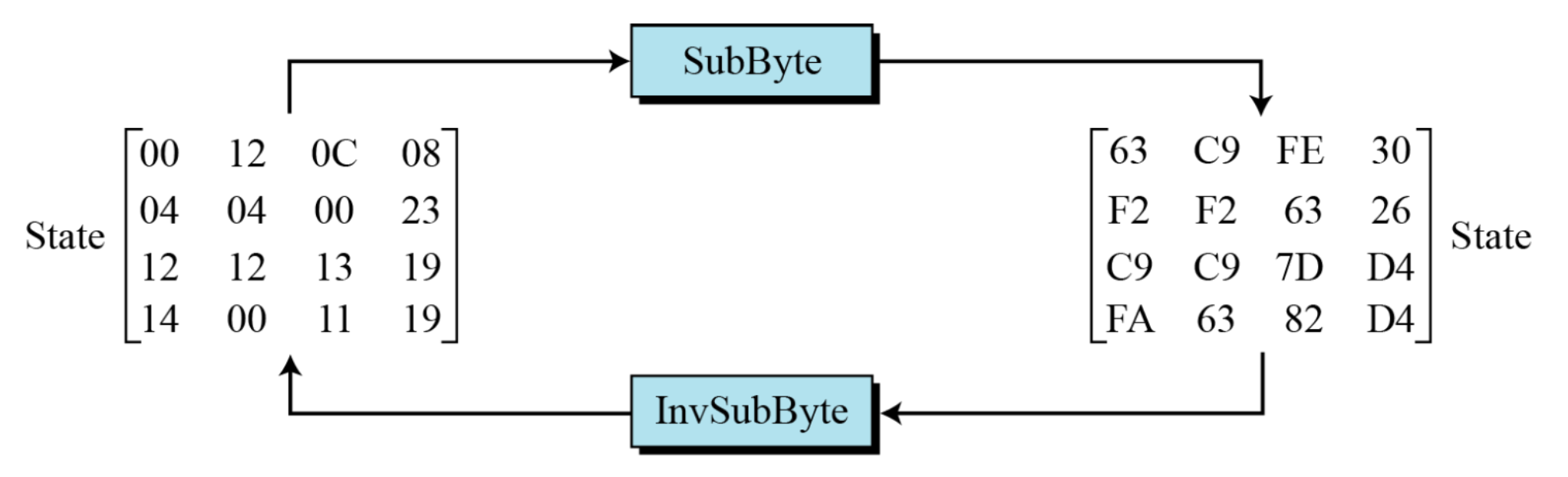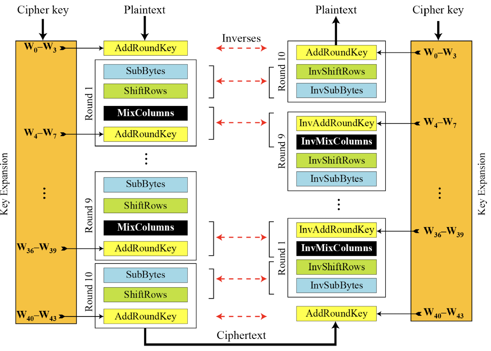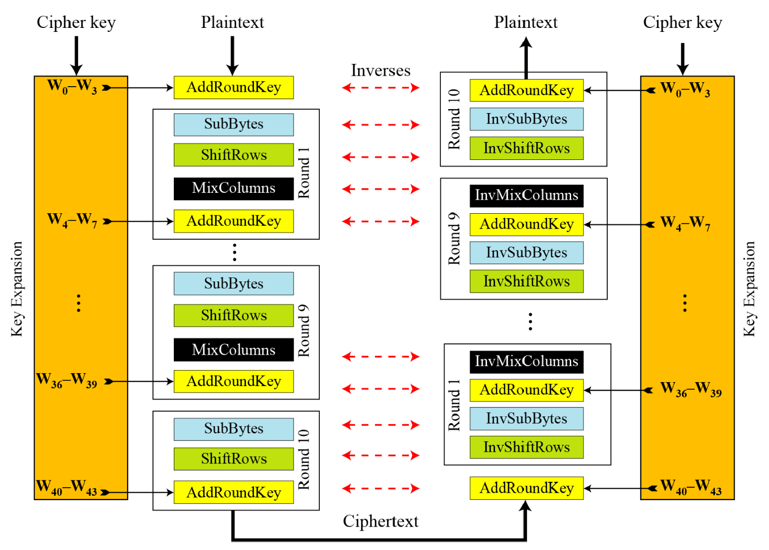 표준에서 암호화 알고리즘은 cipher, 복호화 알고리즘은 inverse cipher라 한다.