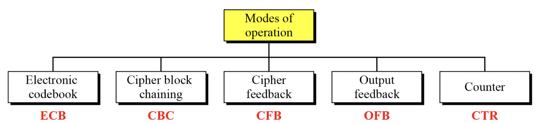 NIST SP 800-38A는 5가지 모드를 정의한다. 다양한 응용을 커버하기 위한 것으로, Triple DES와 AES를 포함한 모든 블록 암호와 함께 사용할 수 있다.
