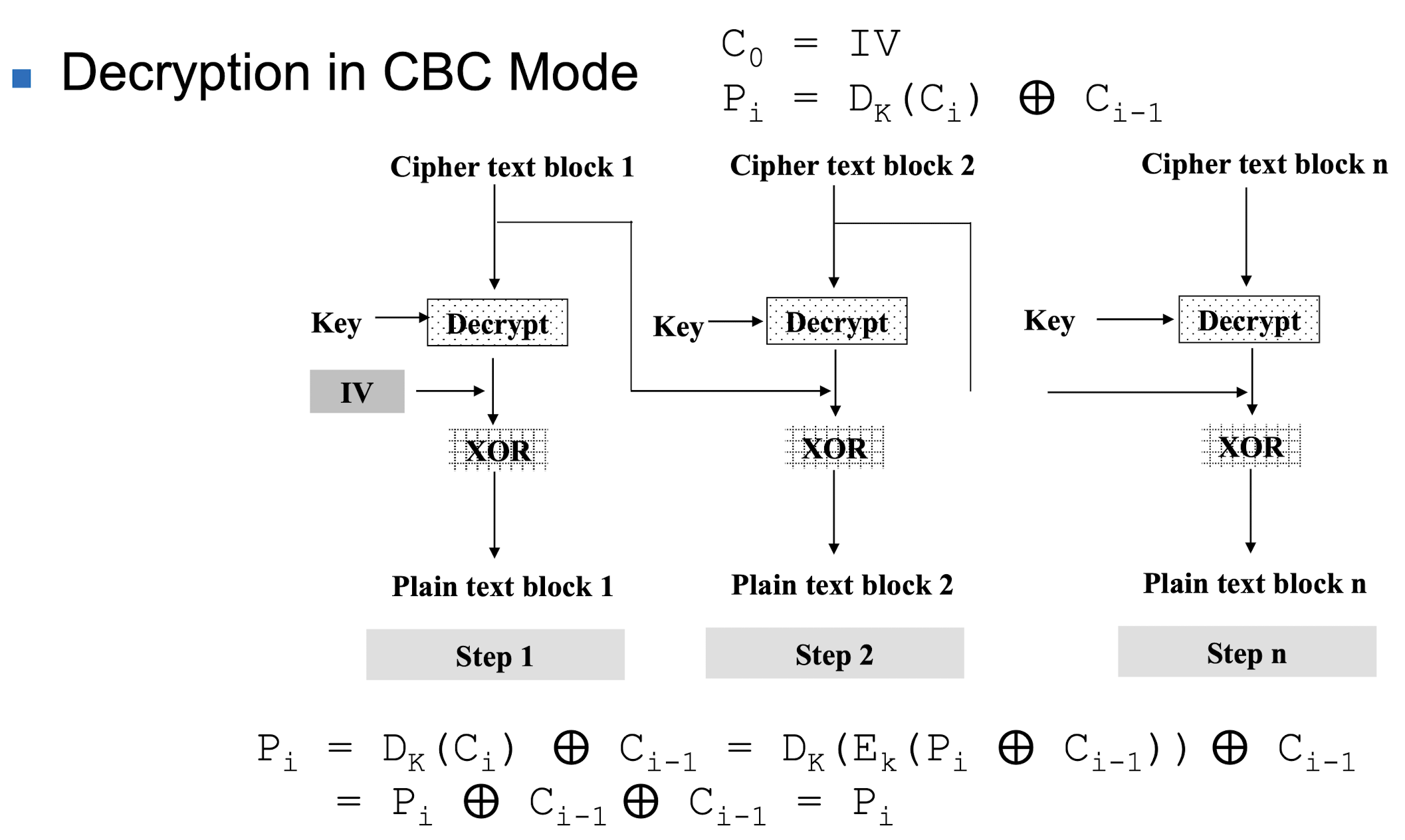- Cⱼ의 단일 오류는 복호화 시 Pⱼ의 대부분 비트에 오류를 생성하고 Pⱼ₊₁의 한 비트만 토글(영향을 줌). Pⱼ₊₂부터 Pₙ은 영향권 밖