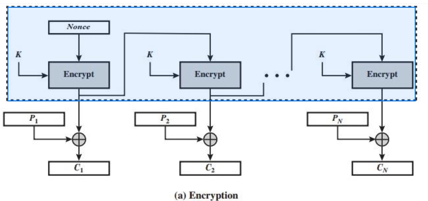 - 양쪽 끝에서 블록 암호가 암호화 모드로 사용됨